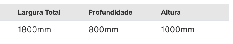 Largura: 1,80 | 0,80 profundidade | 1m altura